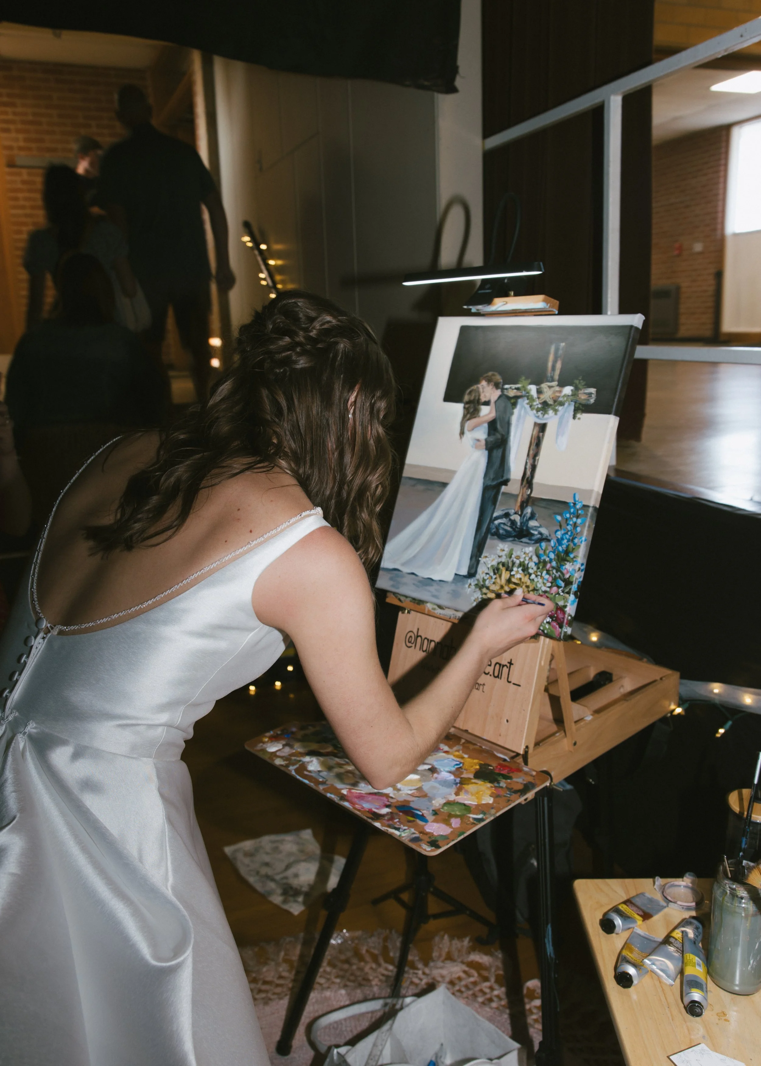 By mid-reception, you and your groom will have been painted into the scene and be nearly completely finished. The rest of the reception is dedicated to touchups on the background and adding all the special little details that make your day so unique. Once the entire painting is complete, I will grab your photographer and you and your groom for the big reveal! You’ll be able to add your own little paint marks to the painting as well as take a few photos with the painting to look back on. After that, the painting is varnished, left in the hands of a trusted individual, and I pack up to head home!